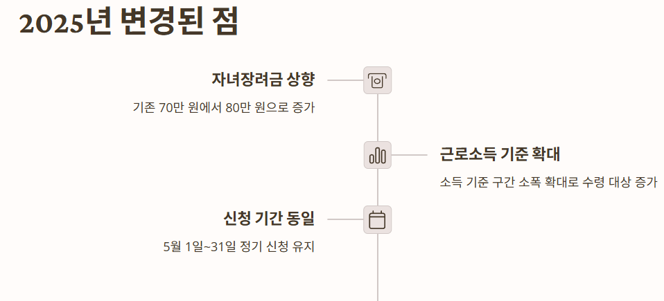 2025년 장려금 제도에는 다음과 같은 변화가 있습니다. 먼저 자녀장려금의 상한 금액이 기존 70만 원에서 80만 원으로 상향 조정되었습니다. 또 근로소득 기준 구간이 소폭 확대되어 수령 대상이 늘어날 것으로 보입니다.