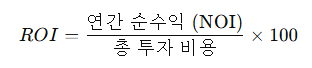 순수익(Net Operating Income, NOI)을 계산한 후, 투자 수익률(Return on Investment, ROI)을 평가한다. ROI 계산 공식은 다음과 같다.