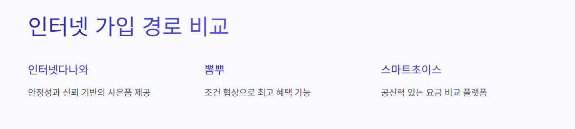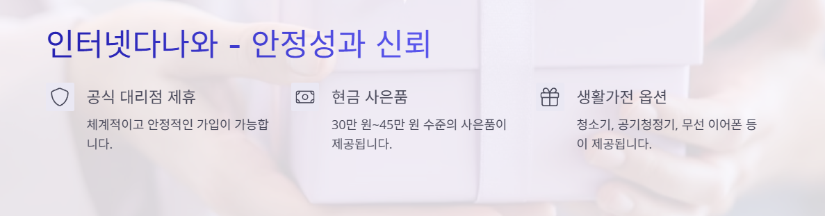 ‘인터넷다나와’는 국내 대표적인 가격비교 플랫폼인 다나와에서 운영하는 인터넷 통신 비교 서비스입니다. 장점은 공식 대리점과의 제휴를 통해 체계적이고 안정적인 가입이 가능하다는 점입니다. 다나와는 통신사별 요금제, 설치 조건, 사은품 혜택을 한눈에 비교할 수 있게 도와주는 구조이며, 별도의 전화 상담 없이도 대략적인 혜택 조건을 먼저 확인할 수 있습니다.