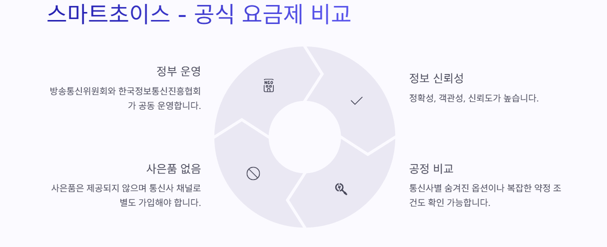 ‘스마트초이스’는 방송통신위원회와 한국정보통신진흥협회가 공동으로 운영하는 공식 요금제 비교 사이트입니다. 가장 큰 장점은 정부기관이 운영하기 때문에 정보의 정확성, 객관성, 신뢰도가 높다는 것입니다. 인터넷, 휴대폰, 유무선 결합 상품 등을 요금제 기준으로 공정하게 비교할 수 있으며, 통신사별 숨겨진 옵션이나 복잡한 약정 조건도 자세하게 나옵니다.