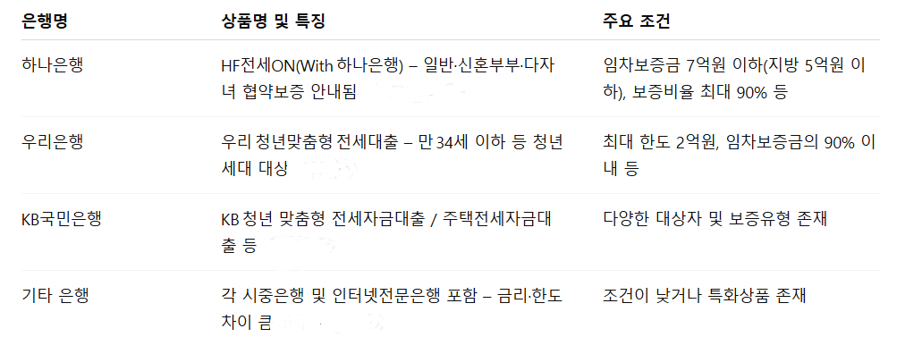 전세자금대출을 검토하신다면 우선 주요 은행이 어떤 상품을 제공하고 있는지 확인하는 것이 중요합니다. 대표적으로 하나은행, 우리은행, 국민은행 등이 있으며, 이들 은행은 약관·조건·대출한도·금리 차이가 있습니다.