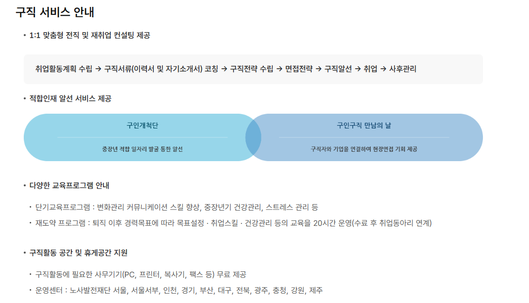 특히 ‘전직스쿨’과 ‘생애설계 프로그램’은 참여 만족도가 매우 높고, 실제 재취업 연계율도 높은 프로그램입니다.