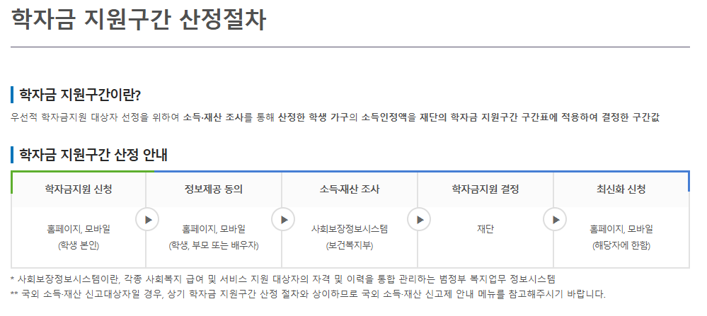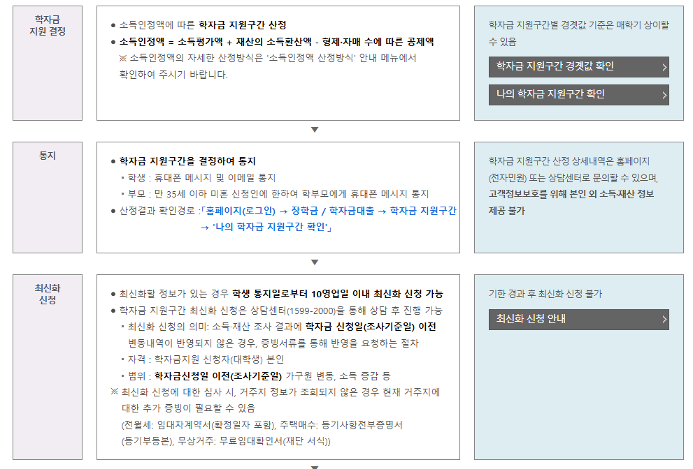 - 소득 구간: 한국장학재단의 소득 인정액 심사를 통해 9구간까지 지원이 가능하며, 소득 인정액에는 근로 소득, 재산 소득, 기타 소득 등이 포함됩니다.