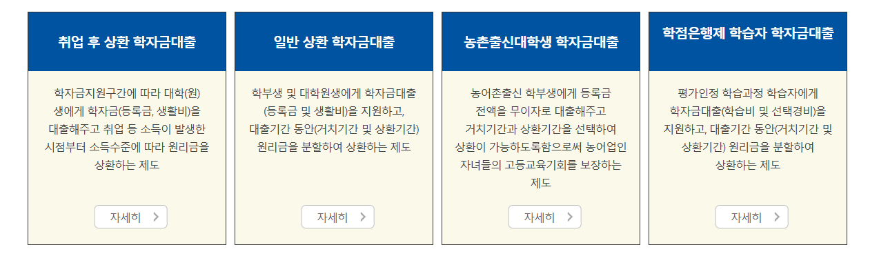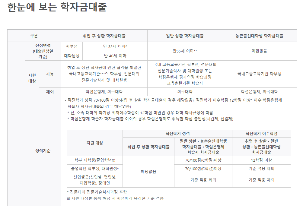 • 일반 상환 대출: 만 55세 이하의 학부 및 대학원생 누구나 신청 가능하며, 소득분위 제한이 없습니다.