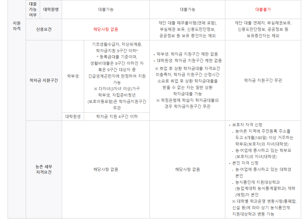 - 농촌출신 융자: 농촌 지역에 6개월 이상 거주하거나 부모가 농어업에 종사하고 있어야 하며, 한국장학재단의 별도 심사를 통과해야 합니다.