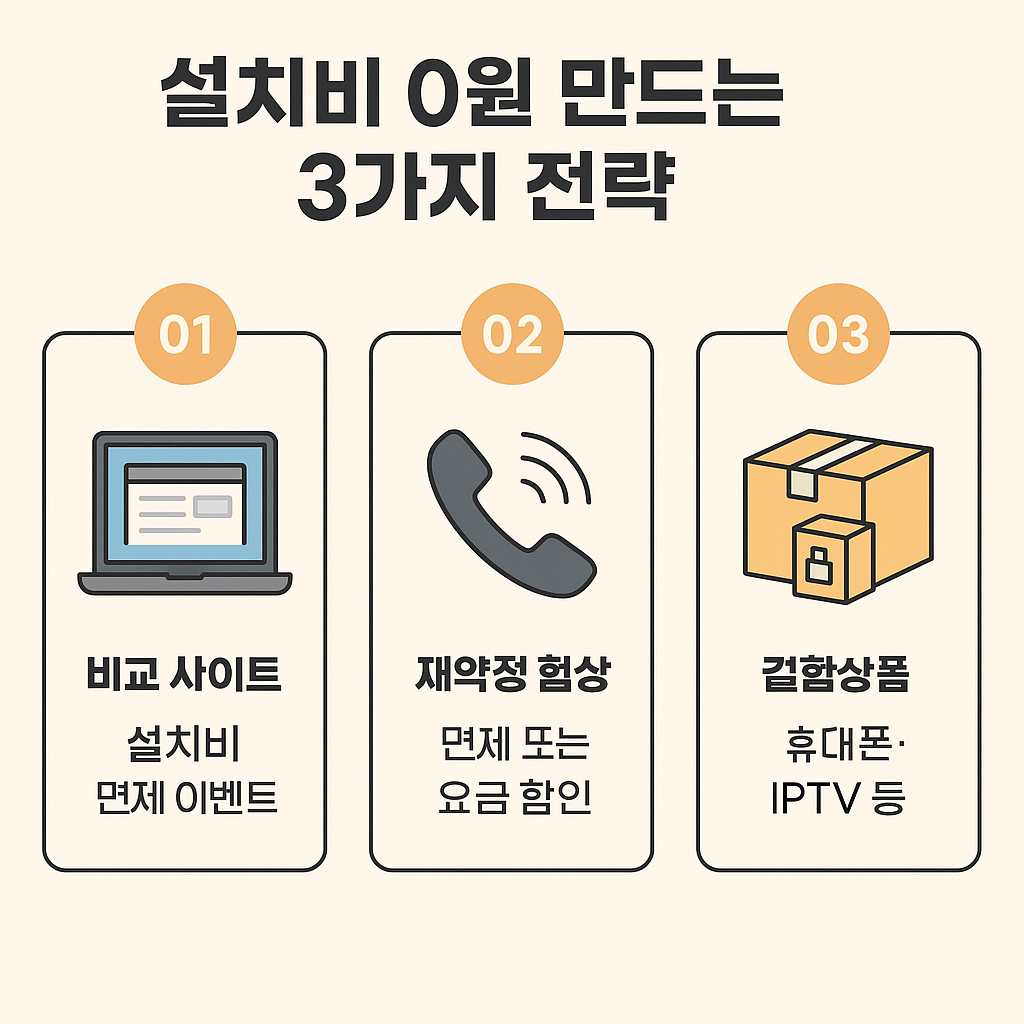 휴대폰, IPTV, 인터넷을 **같은 통신사에서 묶어 결합**하면 요금 할인과 함께 설치비 면제 조건도 제공받을 수 있습니다. LG U+, KT, SK 모두 결합 시 설치비 할인 프로모션을 자주 운영하니, 가입 전 반드시 확인하세요.