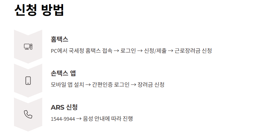 - 홈택스: PC에서 국세청 홈택스 접속 → 로그인 → 신청/제출 → 근로장려금 신청