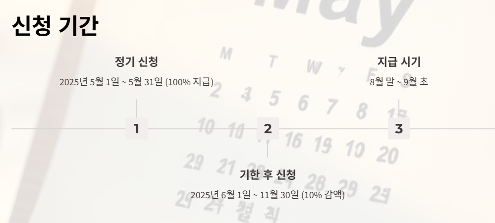 - 기한 후 신청 시 지급 금액이 10% 감액되므로, 반드시 5월 안에 정기 신청을 완료하세요.