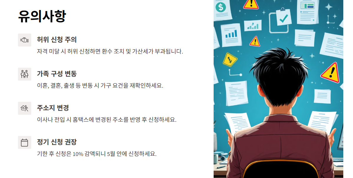 - 신청 자격이 안 되는 경우에는 허위 신청 시 향후 환수 조치 및 가산세 부과가 될 수 있습니다.