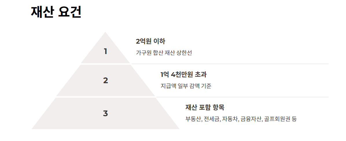 가구원 모두의 합산 재산이 **2024년 6월 1일 기준으로 2억 원 이하**이어야 합니다. 재산에는 부동산, 전세금, 자동차, 금융자산(예금·주식 등), 골프회원권 등이 포함됩니다. 단, 총 재산이 1억 4천만 원을 초과할 경우 지급액이 일부 감액될 수 있으므로 주의해야 합니다.